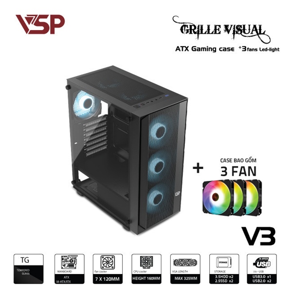 Thùng máy CASE VSP V3 Đen (Mặt trước Lưới + 3 Fan)
