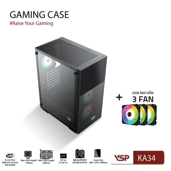 Thùng máy CASE VSP KA34 Đen (Mặt trước Lưới + 3 Fan)